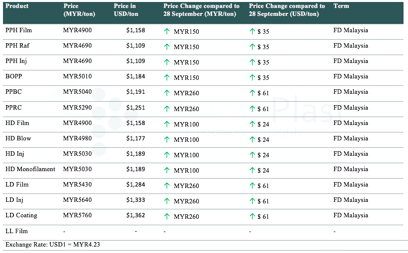 A major producer from Malaysia has announced new price list for November delivery since 26 October 2016 with an increased of MYR100/ton ($24/ton) for HDPE, MYR150/ton ($35/ton) for homo-PP and MYR260/ton ($61/ton) for copolymer-PP and LDPE as compared to last month.