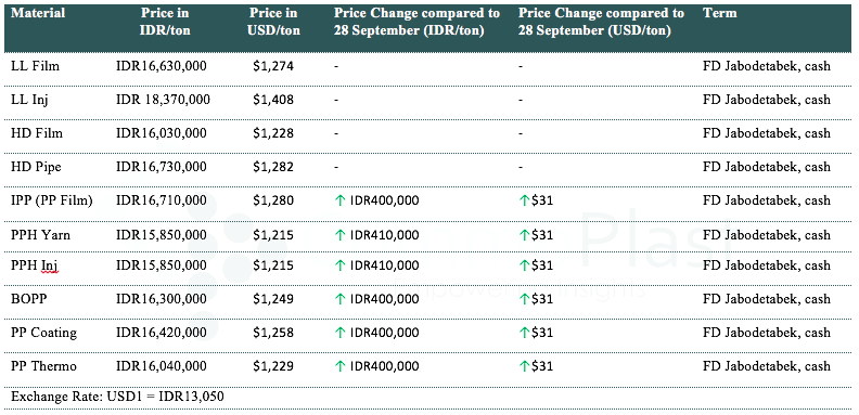 A major maker in Indonesia has announced new offers on beginning of the week for local market with an increased of IDR400,000-410,000/ton ($31/ton) for all PP grades, maintaining other offers stable as compared to their latest offers on 28 September 2016.