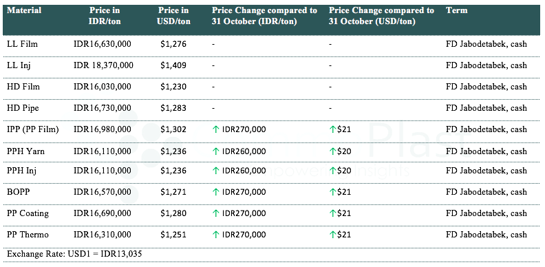 A major maker in Indonesia has lifted its PP offers as much as IDR260,000-270,000/ton ($20-21/ton), maintaining other offers stable as compared to their latest offers yesterday. The price increased of PP all grades was due to limited supply situation.