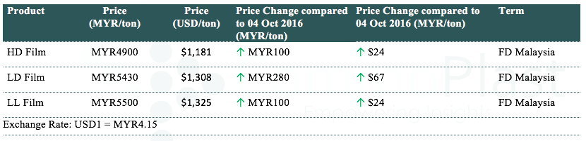 Market players reported that another major producer in Malaysia has announced new offers for November delivery with an increased of of MYR100/ton ($24/ton) for HDPE and LLDPE, and MYR280/ton ($67/ton) for LDPE compared to their offers last month. The latest price list is shown in the following table: