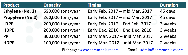 Lotte Chemical Titan (M) Sdn Bhd has reportedly postponed annual turnaround work at its petrochemical complex in Pasir Gudang until first quarter 2017, except for one of the HDPE lines. The plant was initially planned to go off-line during December 2016. Updated shutdown schedule is shown in the following table:
