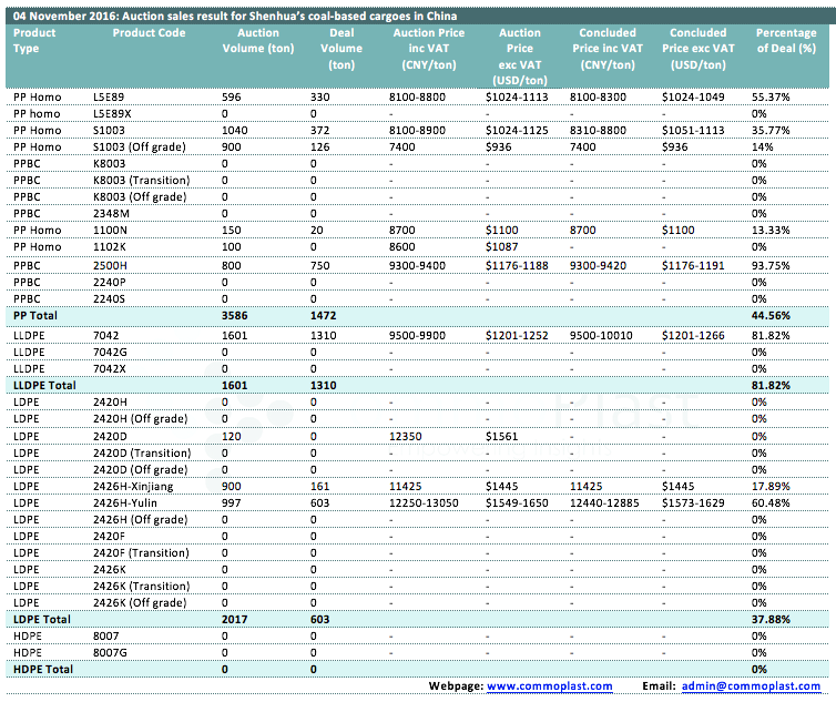 04 November 2016: Auction sales result for Shenhua's coal-based cargoes in China