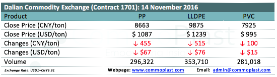Contract number 1701 on Dalian Commodity Exchange on 14 November 2016 settled as following: