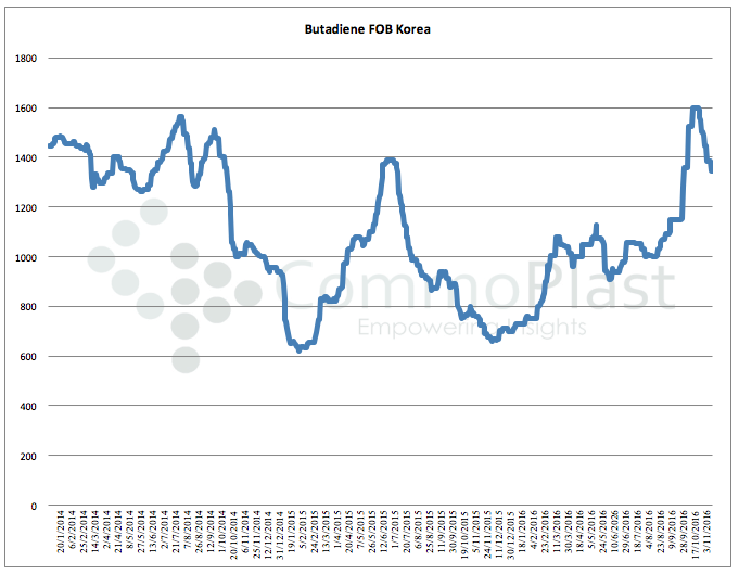 In fact, from 27 September 2016 – when Shell’s cracker encountered technical issues to 21 October 2016, butadiene price based on FOB Korea term surged $445/ton to reach $1600/ton - the level market has not seen since November 2013.