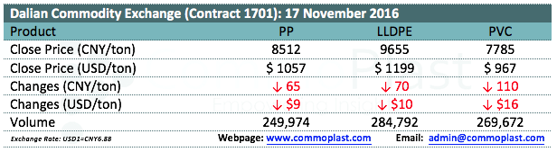 Contract number 1701 on Dalian Commodity Exchange on 17 November 2016 settled as following:
