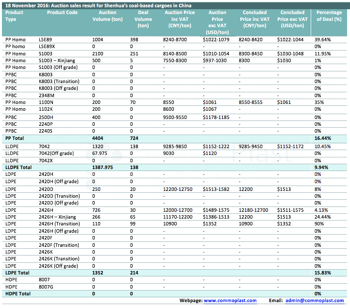 Auctions sales result for Shenhua’s coal-based polyolefin products in domestic China are as following: