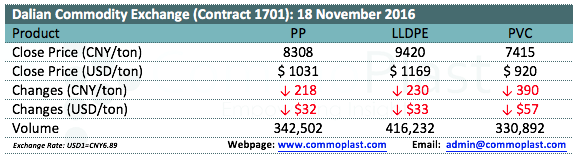 Contract number 1701 on Dalian Commodity Exchange on 18 November 2016 settled as following: