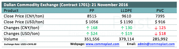 Contract number 1701 on Dalian Commodity Exchange on 21 November 2016 settled as following: