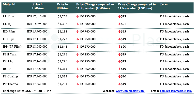 A major producer in Indonesia has announced new offers today with a decrease of IDR250,000-280,000/ton ($19-21/ton) for LLDPE, IDR250,000-740,000/ton ($19-55/ton) for HDPE and IDR250,000-270,000/ton ($19-20/ton) for PP, as compared to their latest offers price hike for its PP and PE offers today with an increase of IDR630,000-700,000/ton ($47-53/ton) for LLDPE, IDR610,000-630,000/ton ($46-47/ton) for HDPE and IDR630,000-660,000/ton ($47-50/ton) for PP, as compared to their latest offers since beginning of the week.