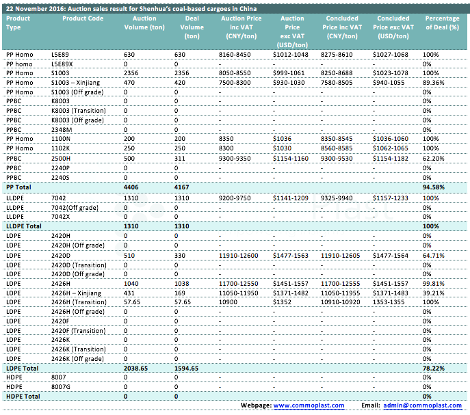 Auctions sales result for Shenhua’s coal-based polyolefin products in domestic China are as following: