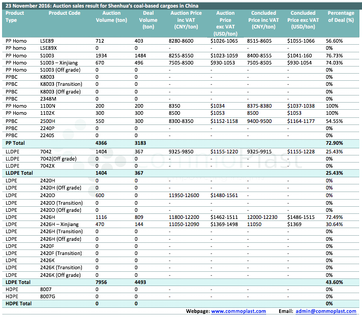 Auctions sales result for Shenhua’s coal-based polyolefin products in domestic China are as following: