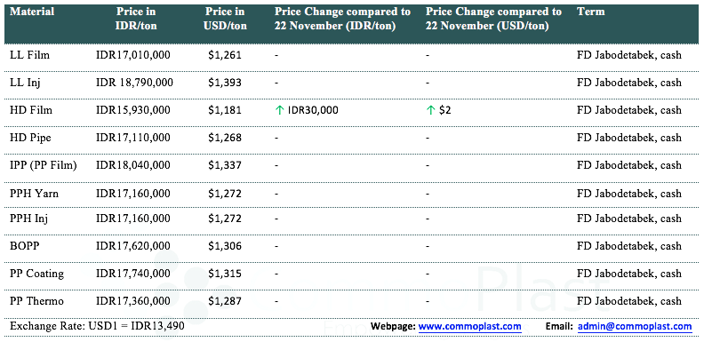 A major producer in Indonesia has announced new offers on beginning of the week with an increased of IDR30,000/ton ($2/ton) for HDPE film, maintaining stable offers for other grades, as compared to their latest offers last week.