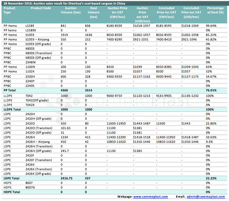 Auctions sales result for Shenhua’s coal-based polyolefin products in domestic China are as following: