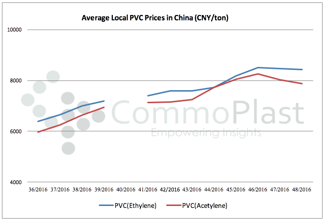 After three months on continuous increases, domestic offers for carbide based PVC in China has been weakening for three weeks in a row now. Compared to the peak recorded during mid of November 2016, carbide based PVC have dropped approximate CNY375/ton ($54/ton) this week. Players are blaming the weakening futures market and ease in transportation issues, which alleviate the supply tightness condition for such rapid drop. However, this has widened the price gap between ethylene based and carbide based PVC.