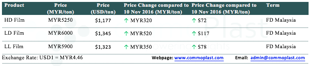 Market players reported that another major maker in Malaysia has announced its new offers for December delivery with an increased of MYR320/ton ($72/ton) for HDPE, MYR520/ton ($117/ton) for LDPE, and MYR350/ton ($78/ton) for LLDPE as compared to their latest offers by 10 November 2016. Players attributed the large price hike toward the recent depreciation of currency.
