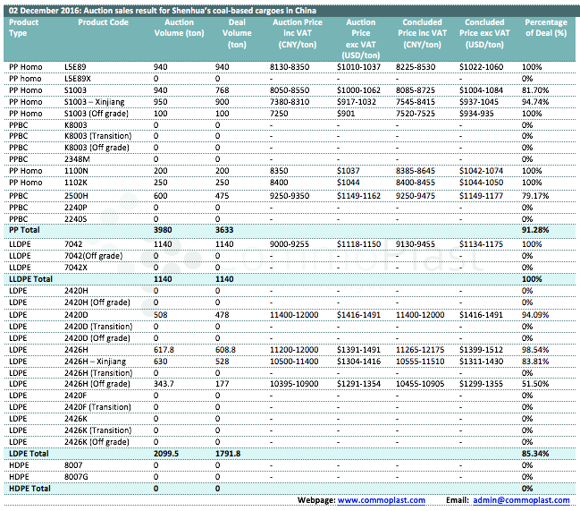 02 December 2016: Auction sales result for Shenhua's coal-based cargoes in China