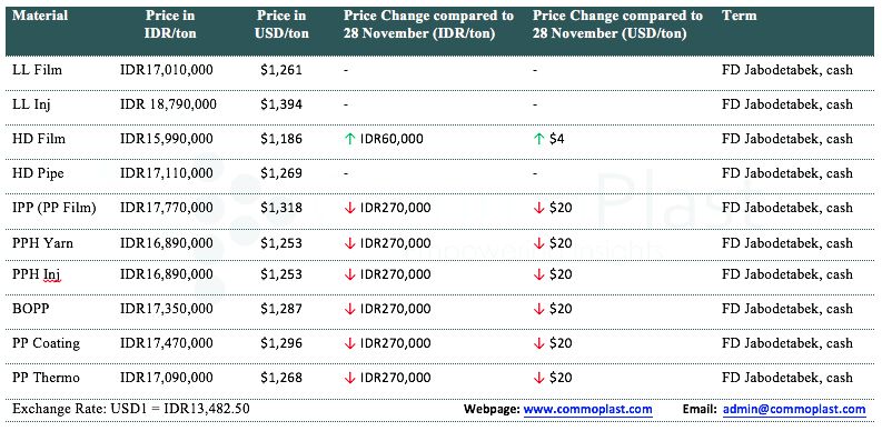 A major producer in Indonesia has announced new offers on beginning of the week with an increased of IDR60,000/ton ($4/ton) for HDPE film, reduced IDR270,000/ton ($27/ton) for PP, meanwhile maintaining stable offers for other grades, as compared to their latest offers last week.