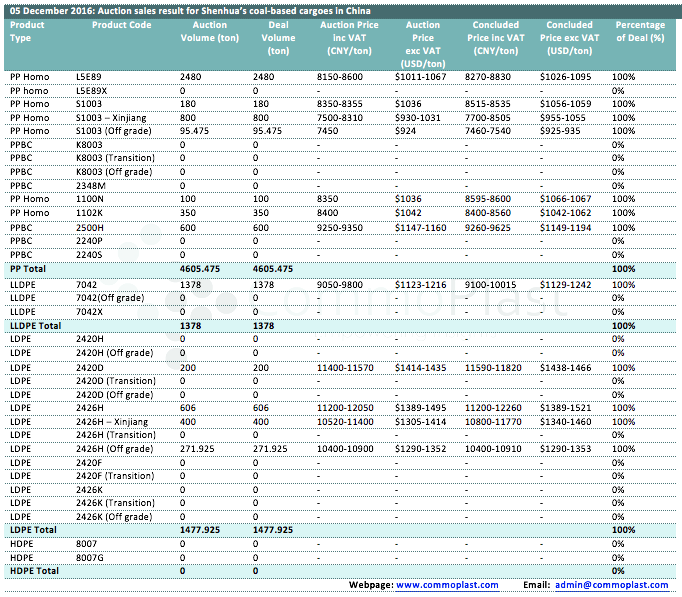 Auctions sales result for Shenhua’s coal-based polyolefin products in domestic China are as following: