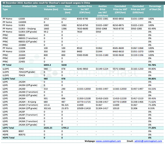 Auctions sales result for Shenhua’s coal-based polyolefin products in domestic China are as following: