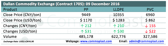 Contract number 1705 on Dalian Commodity Exchange on 09 December 2016 settled as following: