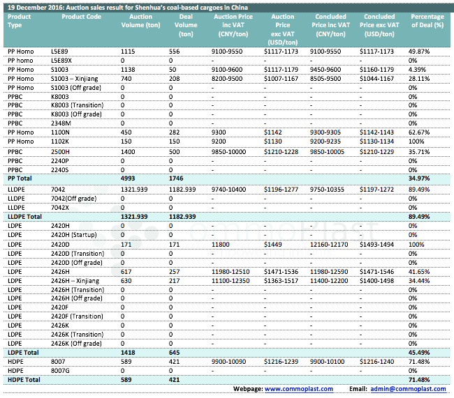 19 December 2016: Auction sales result for Shenhua's coal-based cargoes in China