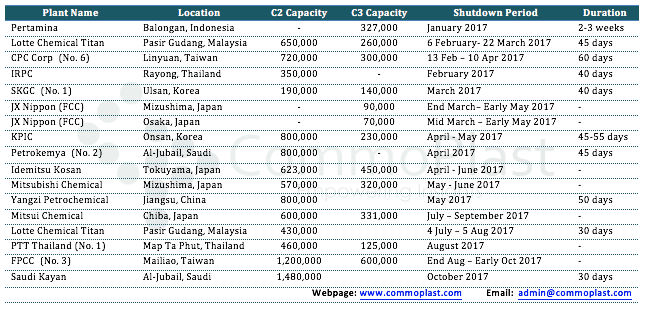 From January to March 2017, the shutdown at Lotte Chemical Titan, CPC Corporation, IRPC and SK Global resulted in an estimated production loss of more than 250,000 tons of ethylene. More schedule shutdowns are concentrated in quarter 2 of 2017.