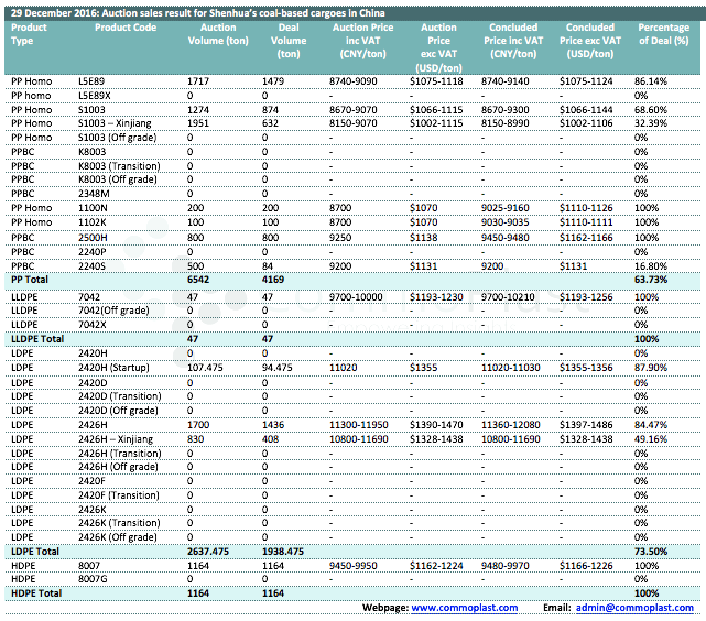 Auctions sales result for Shenhua’s coal-based polyolefin products in domestic China are as following: