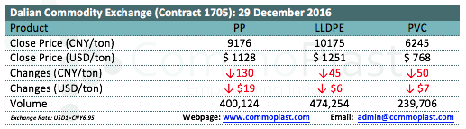 Contract number 1705 on Dalian Commodity Exchange on 29 December 2016 settled as following: