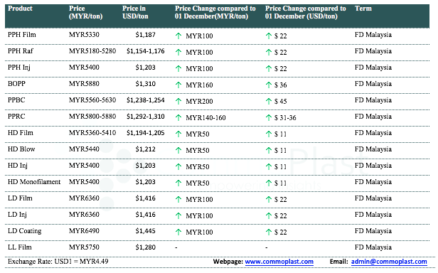 A major producer from Malaysia has announced its offers for January 2017 delivery with an increased of MYR100-160/ton ($22-36/ton) for homo-PP, MYR140-200/ton ($31-45/ton) for copolymer-PP, MYR100/ton ($22/ton) for LDPE and MYR50/ton ($11/ton) for HDPE as compared to their latest offers on beginning of the month. Players attributed the price hike towards the continuous weaker currency as well as limited supply due to upcoming scheduled turnaround.