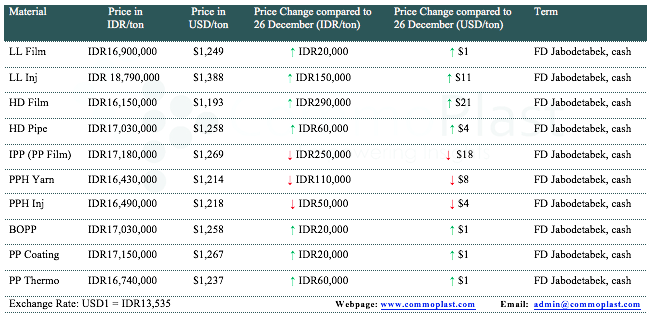 A major maker in Indonesia has announced January offers for domestic market on beginning of the week with mixed adjustments for its PP and PE today, with IDR20,000-150,000/ton ($1-11/ton) increased for LLDPE, IDR60,000-290,000/ton ($4-21/ton) increased for HDPE, IDR50,000-250,000/ton ($4-18/ton) reduction for homo-PP film, injection, and yarn, IDR20,000-60,000/ton increased for BOPP, PP coating and thermo grades as compared to last week.