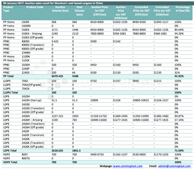 04 January 2017: Auction sales result for Shenhua's coal-based cargoes in China