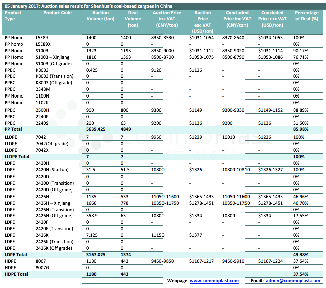 Auctions sales result for Shenhua’s coal-based polyolefin products in domestic China are as following: