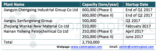 There are 6 new PET plants with a combined annual production capacity as much as 2.75 million tons/year which going to be start up by this year. The details of the plants are shown in the following table: