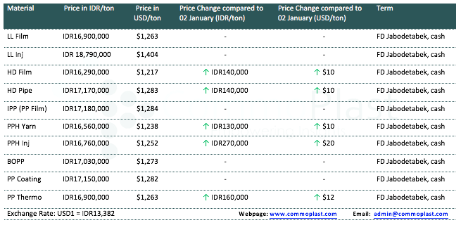 A major maker in Indonesia has announced new offers for domestic market on beginning of the week with stable to firm trend for PP and PE, with IDR140,000/ton ($10/ton) increased for HDPE, IDR130,000/ton ($10/ton) increased for homo-PP raffia, IDR270,000/ton ($20/ton) increased for homo-PP injection, and IDR160,000/ton ($12/ton) increased for thermoforming PP, while other grades remain stable as compared to last week.