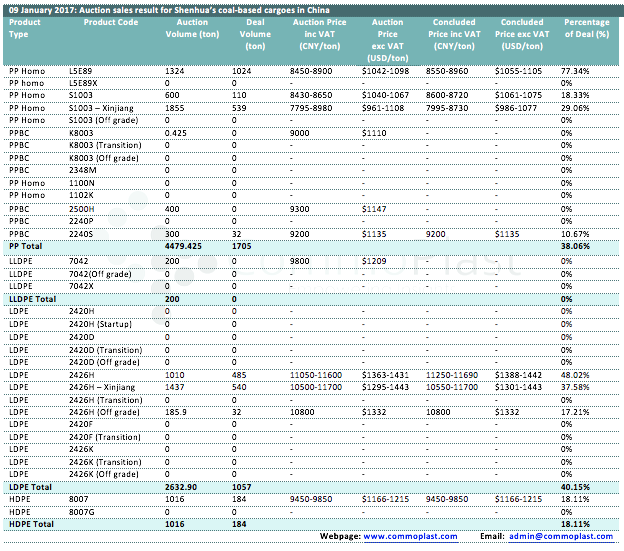Auctions sales result for Shenhua’s coal-based polyolefin products in domestic China are as following:
