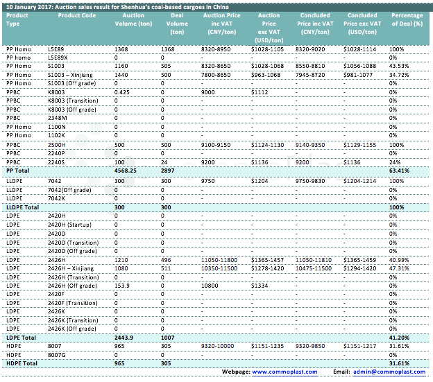 Auctions sales result for Shenhua’s coal-based polyolefin products in domestic China are as following: