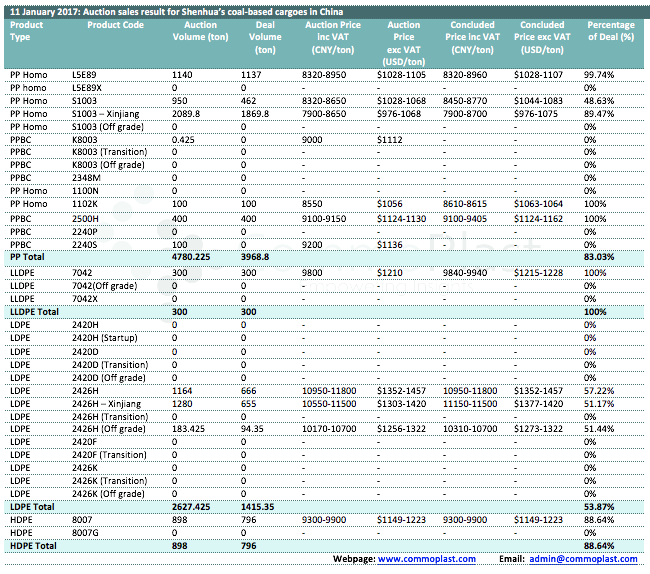 11 January 2017: Auction sales result for Shenhua's coal-based cargoes in China