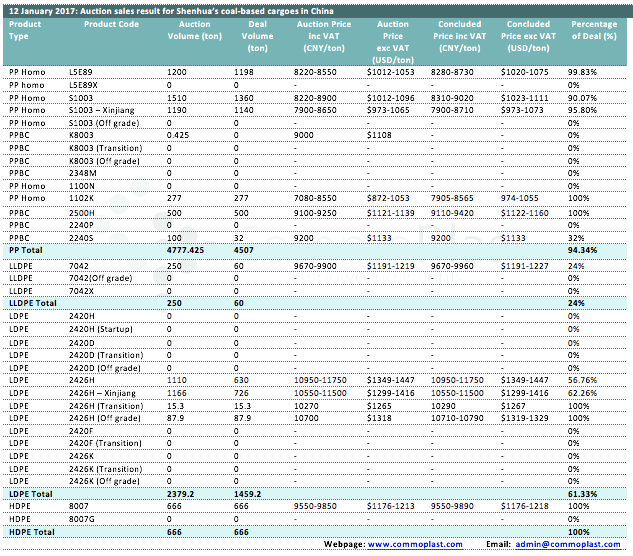 12 January 2017: Auction sales result for Shenhua's coal-based cargoes in China