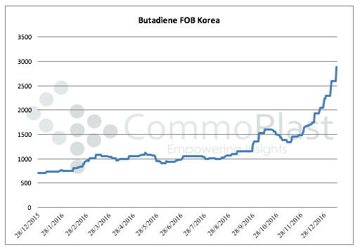 In Asia, butadiene costs based on FOB Korea term has been escalating since late September 2016 and have doubled the value in recent week, touching multi-year high levels. Butadiene price rose $300/ton on last Friday alone, stimulating market expectation for a prolong hike in the downstream ABS market.
