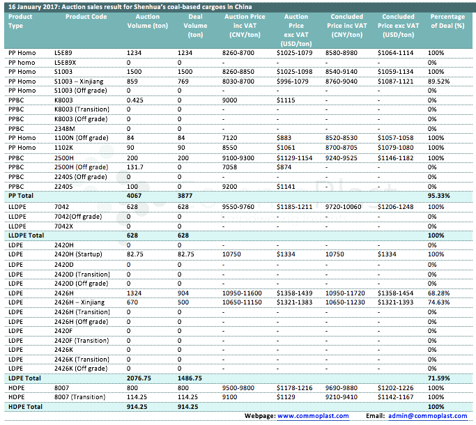 Auctions sales result for Shenhua’s coal-based polyolefin products in domestic China are as following: