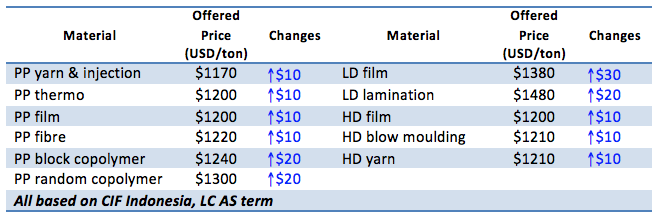 Indonesian buyers reported receiving fresh PP and PE offers for February delivery from a major Malaysian producer today with increases compared to last month. The maker reportedly lifted LDPE film price by $30/ton to reach $1380/ton CIF, LC AS term claiming limited export allocation stemming from the impending plant shutdown in the coming month.