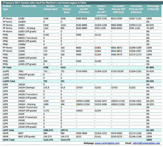 Auctions sales result for Shenhua’s coal-based polyolefin products in domestic China are as following: