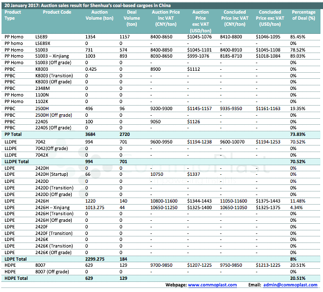 20 January 2017: Auction sales result for Shenhua's coal-based cargoes in China