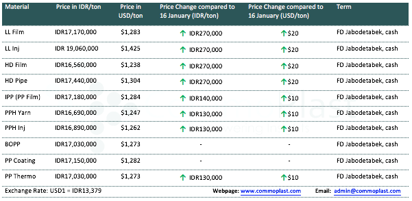 A major producer in Indonesia has announced new offers for domestic market today with an increased of IDR270,000/ton ($20/ton) for PE and IDR130,000/ton ($10/ton) increased for PP except BOPP and PP coating remain stable as compared to last week.
