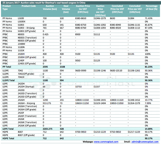 23 January 2017: Auction sales result for Shenhua's coal-based cargoes in China