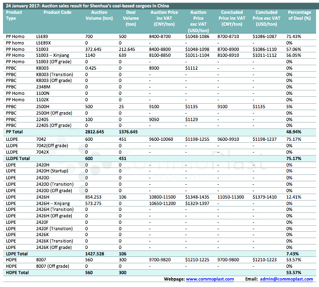 Auctions sales result for Shenhua’s coal-based polyolefin products in domestic China are as following: