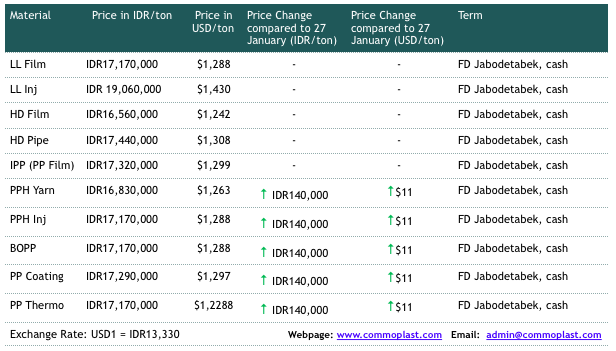 A major maker in Indonesia has announced new offers by beginning of the week with further increased of IDR140,000/ton ($11/ton) for PP, maintaining stable prices for PE as compared to end of January.
