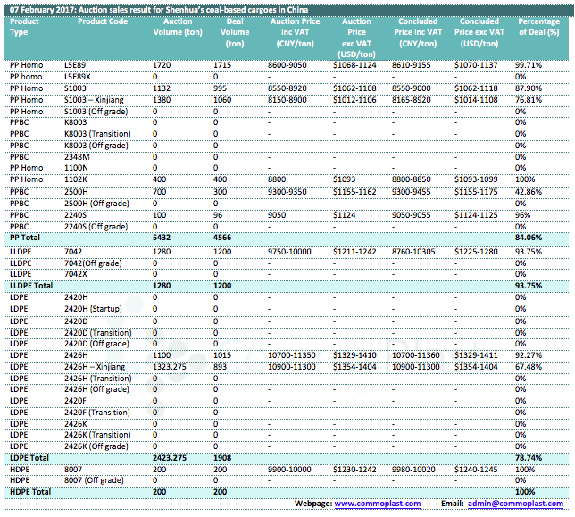 07 February 2017: Auction sales result for Shenhua's coal-based cargoes in China
