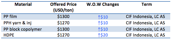 A major Thailand producer has reportedly announced fresh weekly PP and HDPE offers to Indonesia with $10/ton increased compared to last week, claiming limited availability and stronger international ground.
