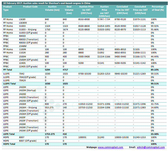 Auctions sales result for Shenhua’s coal-based polyolefin products in domestic China are as following: